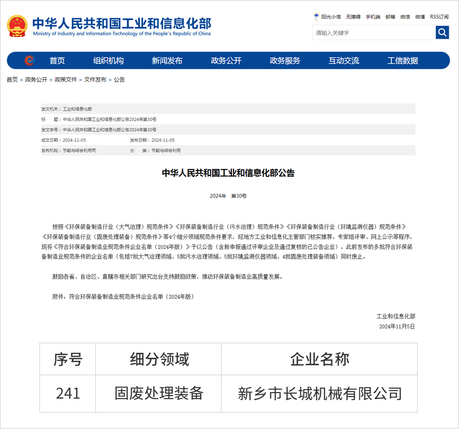 近日,中華人民共和國(guó)工業(yè)和信息化部發(fā)布符合環(huán)保裝備制造業(yè)規(guī)范條件企業(yè)名單(2024年版)。其中,固廢處理裝備類企業(yè),新增11家,復(fù)核通過(guò)47家。新鄉(xiāng)市長(zhǎng)城機(jī)械有限公司憑借固廢處理領(lǐng)域的創(chuàng)新技術(shù)和卓越表現(xiàn),繼2021年入選環(huán)保裝備制造業(yè)規(guī)范條件企業(yè)名單后,今年度再次順利通過(guò)復(fù)核。