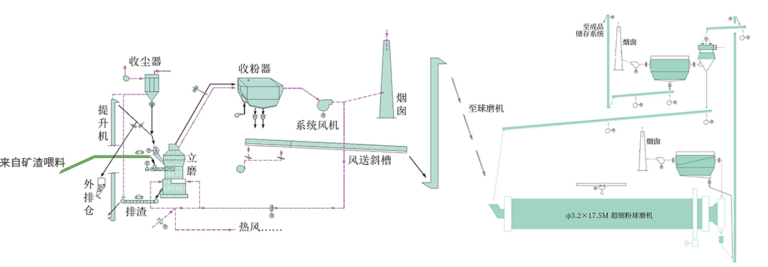 堆放著的礦渣由鏟車取料、喂料,通過皮帶機進行輸送。在輸送過程中,礦渣原料先后經(jīng)由除鐵器和振動篩得到除鐵和篩分,然后通過稱重設備倉、提升機進入立磨機進行粉磨。粉磨后的礦渣借助熱風爐提供的熱風,通過選粉機進行選粉,同時得到烘干。符合細度要求的礦渣粉最后被輸送到收塵器收集、盛放后,由空氣輸送斜槽、提升機進入成品庫中儲存。